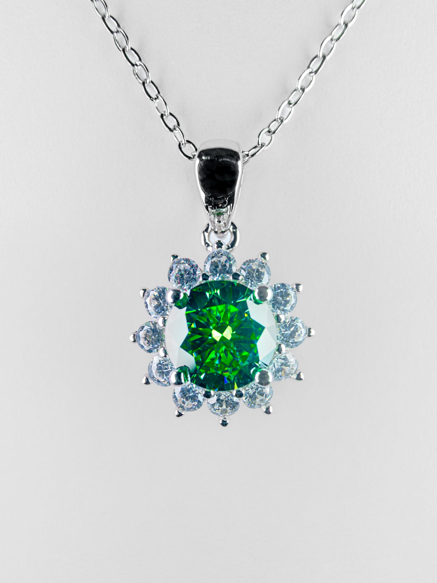 A vivid green moissanite centerpiece, embraced by twelve shimmering whites.