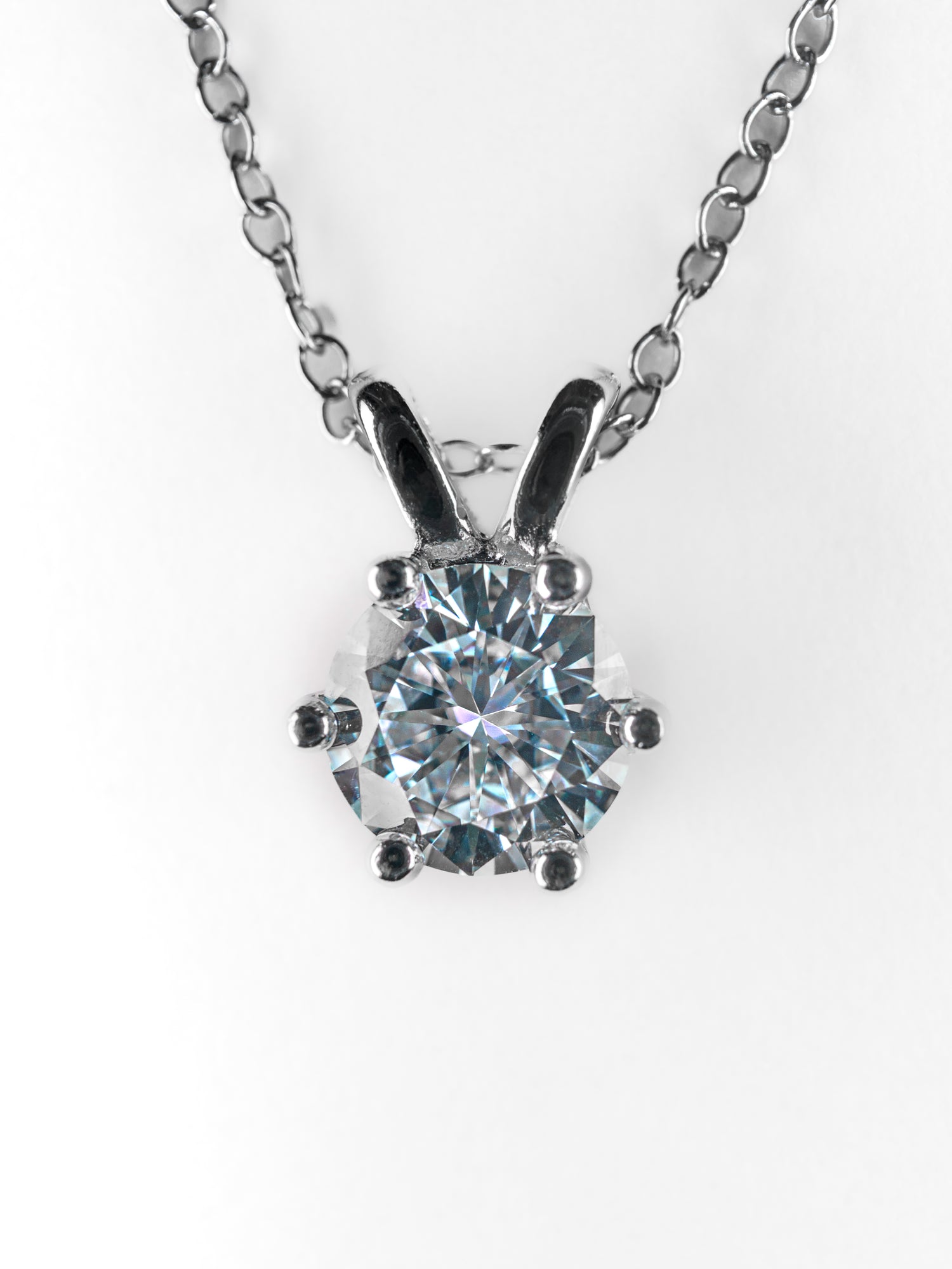 An elegant sparkling white moissanite that shines light reflections like a diamond.