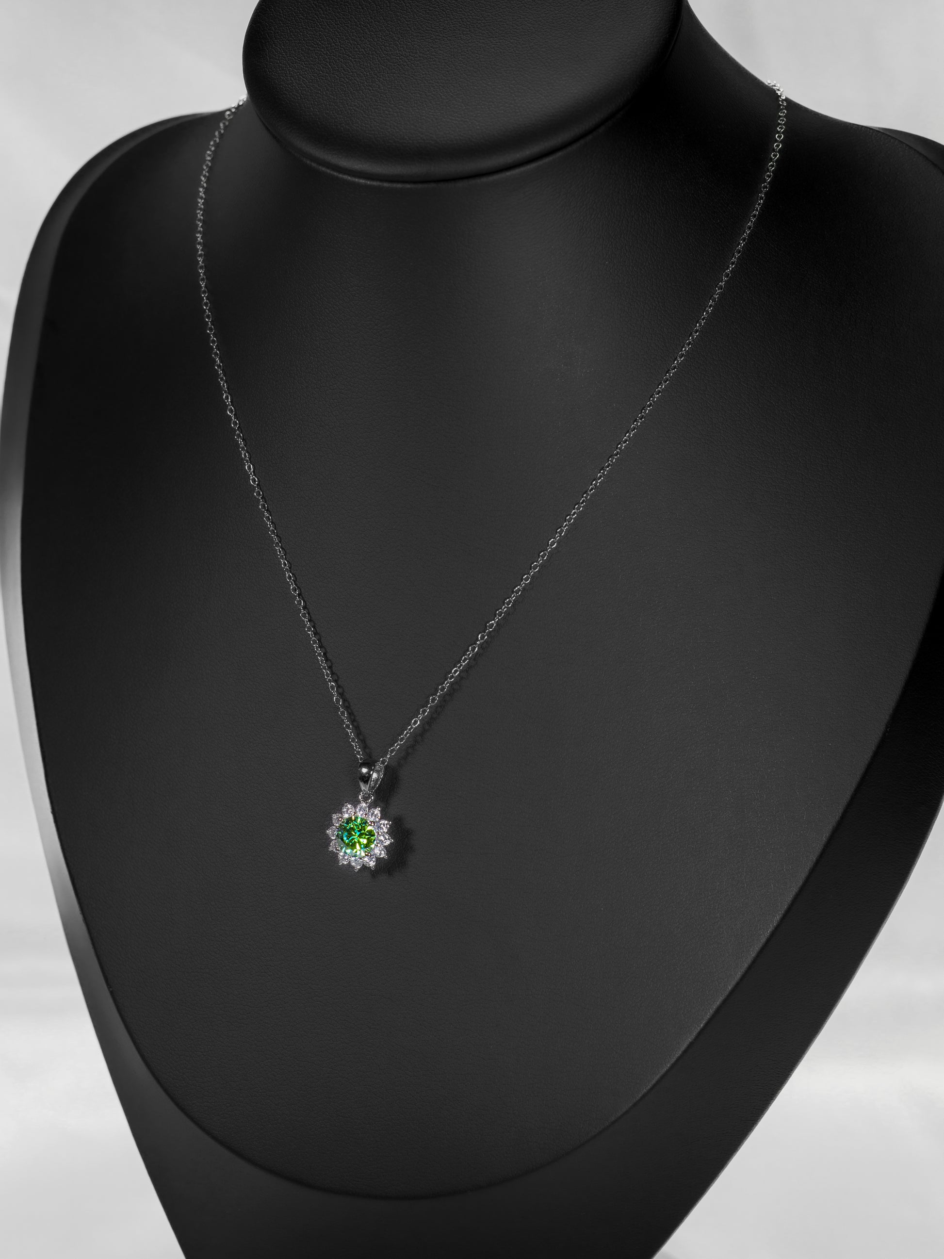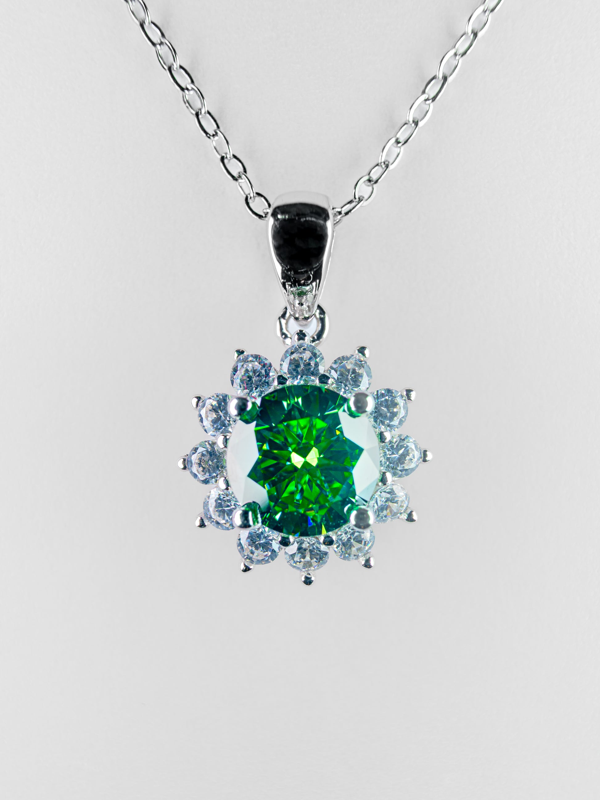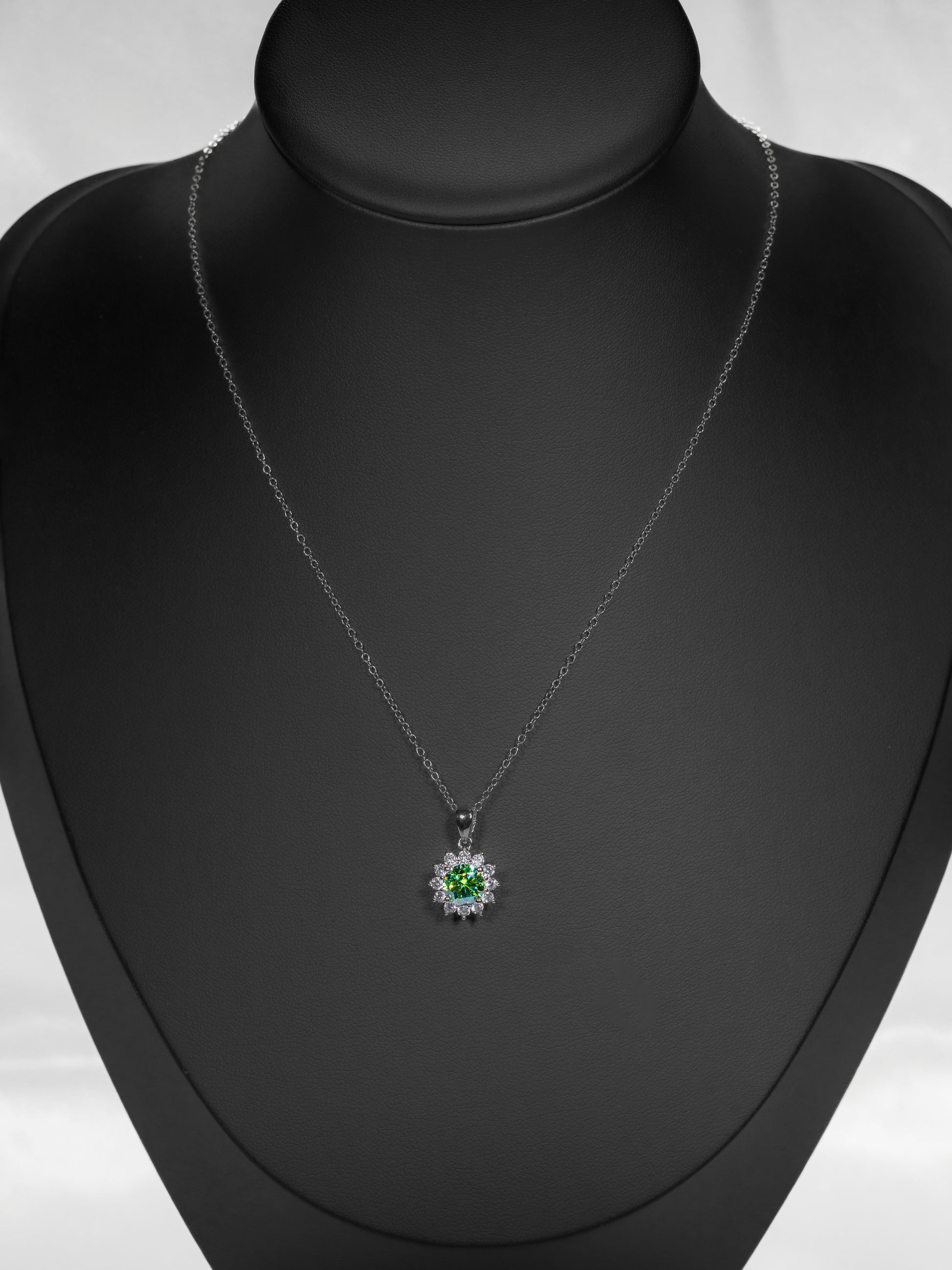This stunning sun-shaped pendant features a mesmerizing deep green 1 carat lab-grown moissanite at its heart surrounded by encircled by twelwe sparkling white stones, all set in a silver-plated mount. A true statement of luxury, Esmeralda’s Sun is crafted to captivate. Its bold yet graceful silhouette captures and reflects the light with exceptional brilliance.